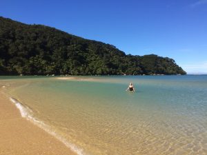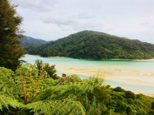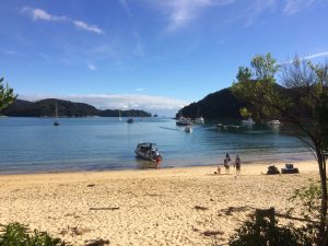 Wir verlassen Picton am frühen Morgen bei allerschönstem Sommerwetter. Diverse Meldungen über durch Zyklon Gita zerstörte Infrastrukturen im „Abel Tasman National Park“ lassen uns zunächst das „Department of Conservation“-Center (DOC) in Nelson ansteuern. Uta, aus Hamburg stammend und seit Jahrzehnten in Neuseeland lebend, hilft uns kompetent weiter. Weil der Wanderweg unserer geplanten vierten Etappe zwischen Awaroa und Wharwharangi Bay aufgrund größerer Wegeschäden gesperrt ist, können wir die letzte Hüttenübernachtung zugunsten einer anschließenden weiteren Übernachtung in Nelson stornieren. Nun geht es flott weiter bis Marahau, unserem Ausgangspunkt für die viertägige Wanderung durch den „Abel Tasman National Park“. Grandioses Sommerwetter und immer wieder fantastische Ausblicke auf traumhafte Sandstrände und glasklares Wasser heben unsere Stimmung, wenngleich die Rucksäcke, vollgepackt mit allem, was wir glauben, für diese Tage mit uns führen zu müssen, gehörig auf Schultern und Hüften drücken. Nach langen Kilometern erreichen wir mit der Anchorage Hut unser erstes Etappenziel.