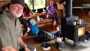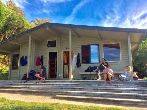 Nach und nach treffen, bei inzwischen stärker gewordenem Regen, weitere Wanderinnen und Wanderer ein. Ein englisches Paar hat, aus Totaranui kommend, das Awaroa Inlett mit seinen Wanderschuhen überquert und steht jetzt völlig durchnäßt in der Hütte. Schnell wird der gusseiserne Ofen in Raummitte angezündet und spendet bald bullige Hitze. Ich kann endlich meine Wäscheleine auspacken und quer durch die Hütte spannen. Viele rücken zusammen, packen Ess- und Trinkbares aus. Gespräche beginnen, die Stimmung taut auf, Fragen, woher man kommt, wohin man geht, wie lange man in Neuseeland bleiben wird, werden gestellt. Erstaunlich, wie viele Nationalitäten sich auf diesem „Great Walk“ treffen, Engländer, Schotten, Deutsche, Niederländer, Schweden, Finnen, Tschechen. Ruedi, ein Schweizer aus Zürich, plant noch eine nächste Wanderetappe, entschließt sich aber kurzfristig, nachdem er sich schon seit Bark Bay offensichtlich gut mit Conny, einer angehenden Lehrerin aus Waldshut-Tiengen, verstanden hat, die Wanderpläne zu begraben. Wir werden beide anderntags in der Jugendherberge in Nelson wieder treffen. Der „Abel Tasman Track“ weckt so oder so magische Momente.