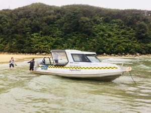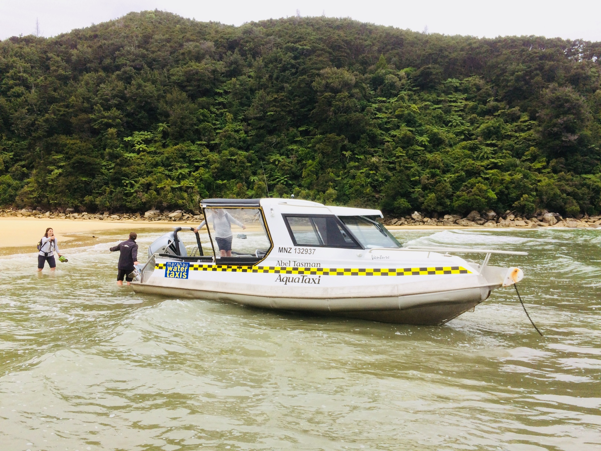 Auch wenn unsere Familien mit Kleinkindern einen eigenen Bunkraum haben, geht es auch diese Nacht und vor allem am frühen Morgen recht unruhig und lautstark zu. Zudem zeigt sich der Morgenhimmel ernsthaft bewölkt und regensatt, weshalb wir spontan entscheiden, es mal mit einem Water Taxi zu versuchen. Tatsächlich legt nach kurzer Wartezeit ein größeres Boot am Medlands Beach an und ihm entsteigen einige Tageswandertouristen. Wir dürfen zusteigen und uns bei rauher See bis zum Strand vor Awaroa bringen lassen. Dank der niedrigen Tide können wir das Awaroa Inlett, eine weite, seichte Bucht, barfüßig überqueren und erreichen unsere letzte Station, die Awaroa Hut schon vor Mittag.