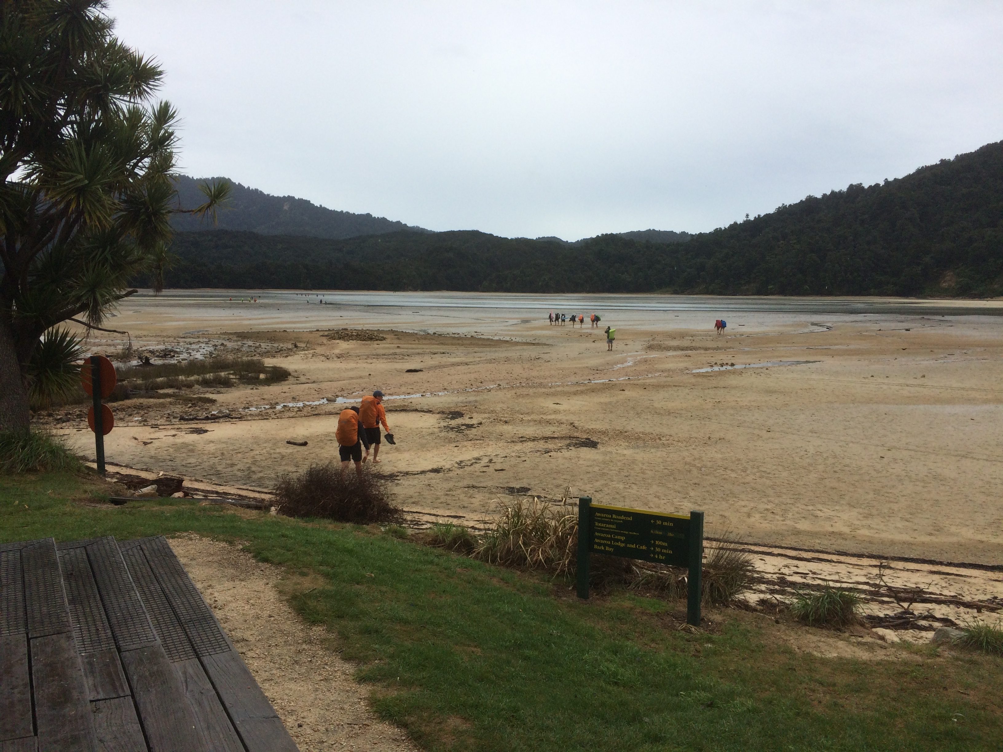 Die Wanderer müssen sich beeilen, um noch einigermaßen trockenen Fußes das weitläufige Awaroa Inlett überqueren zu können.