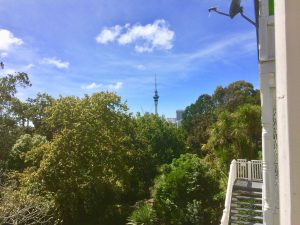 Hinter dem Western Park im Stadtteil Ponsonby ragt der Skytower in die Höhe.