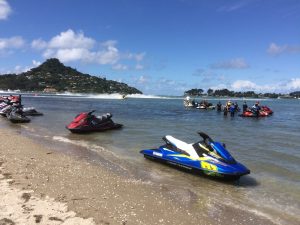 Nach geraumer Zeit klinken wir uns aus, um kurz darauf am Strand von Waikato auf ein Rennen mit „Waverunners“, PS-starken Jetskiers, zu stoßen. Schnell und laut kommt gut!