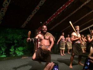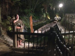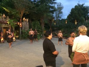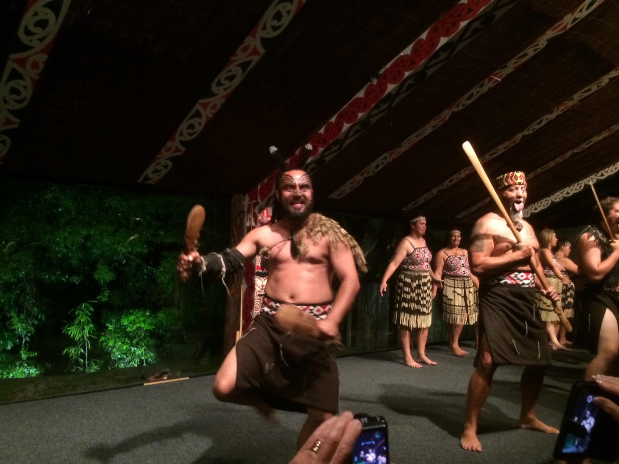 Und weil uns hier auf Schritt und Tritt Maori-Geschichte und -Kultur begegnet, haben wir uns für den Abend in‘s „Tamaki Maori Village“ bei Tumunui, nahe Rotorua, eingeladen. Auf der kurzweiligen Busfahrt weist uns Dennis, der redselige, alte Busfahrer, in die wichtigsten Verhaltensregeln für Besucher ein. Es folgt ein zweifellos touristisches, aber sehr unterhaltsames Programm mit Begrüßung (Kia Ora & Hongi), Rundgang und Demonstration des Lebens eines früheren Maori-Stammes, mit Gesängen und (Kriegs-)Tänzen mit Waffenschwingen, Augenrollen, fürchterliche Grimassen schneiden und Zungen rausstrecken. Dennis hat uns schon früh eingebläut, unter keinen Umständen zu lachen, und wir machen auch keine Sekunde entsprechende Anstalten. Gegen Ende des Programms kommt das gemeinsame Hangi (Festmal) und für uns die Erkenntnis, dass schon die alten Maoris auf Karottengemüse, Kartoffeln und Schweinebraten standen.