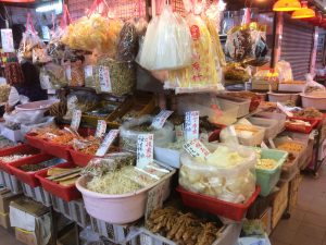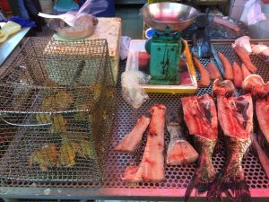 Aber frisch muss es sein. Hier ein Marktstand mit (lebenden) Kröten und Fischen.