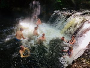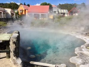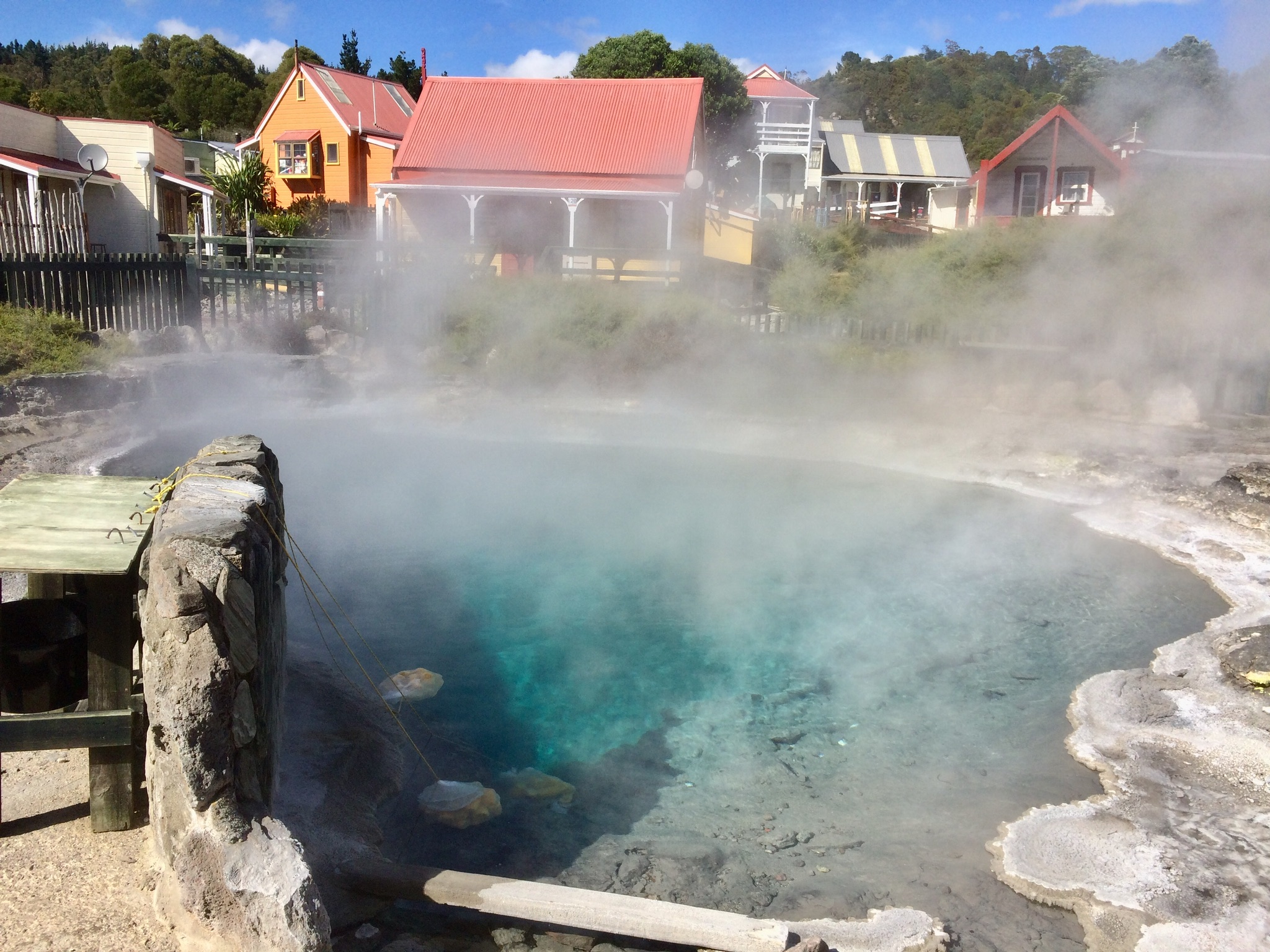 Auch die Missionare der frühen Siedler haben bei den Maoris ganze Arbeit geleistet. So gibt es im Dorf neben einem katholischen auch ein anglikanisches Gotteshaus. Nach so vielen neuen Erkenntnissen freuen wir uns auf eine Erfrischung. Und eine solche, die zudem völlig gratis ist, bietet der „Kerosene Creek“, rund 28 Kilometer hinter Rotorua, Richtung Taupo. Auch wenn an der SH 5 nur ein einfaches Blechschild auf ihn hinweist und er nur über eine ca. 2 Kilometer lange Schotterpiste zu erreichen ist, ist dieser einmalige, ca. 34 Grad warmes Thermalwasser führende Flußlauf längst kein Geheimtipp mehr.