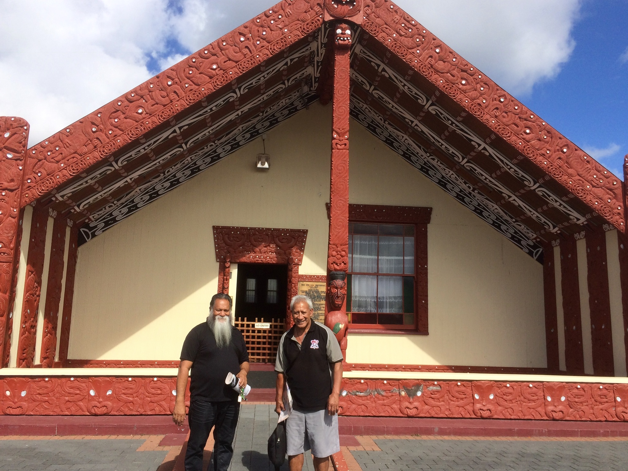 Der Chief des Dorfes (links im Bild) und ein Dorfältester hatten heute eine lange Besprechung im großen „Whare Tipuna“ (Ahnenhaus), ließen sich aber nicht von einem Plausch mit uns abhalten.