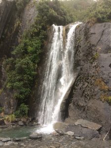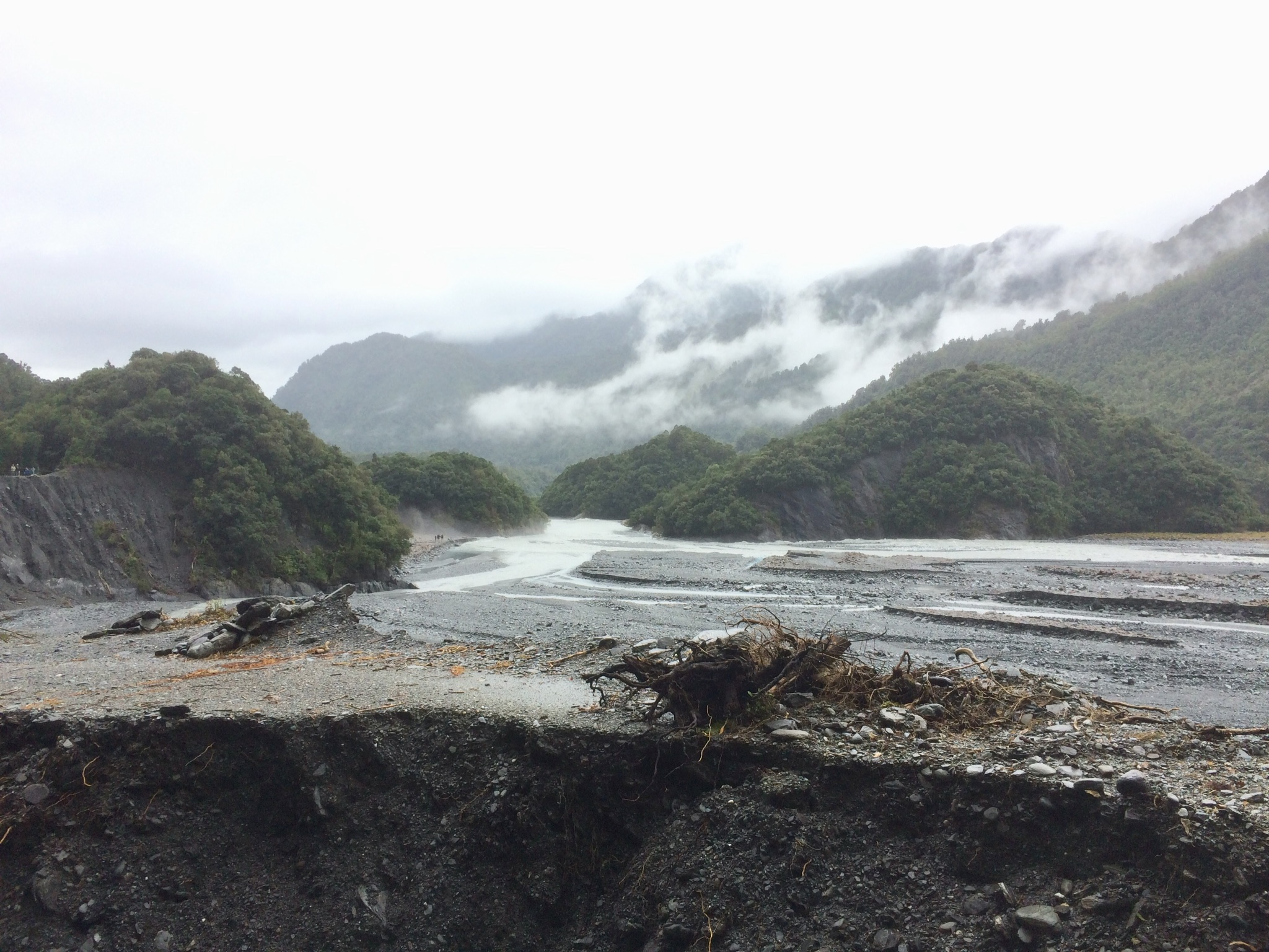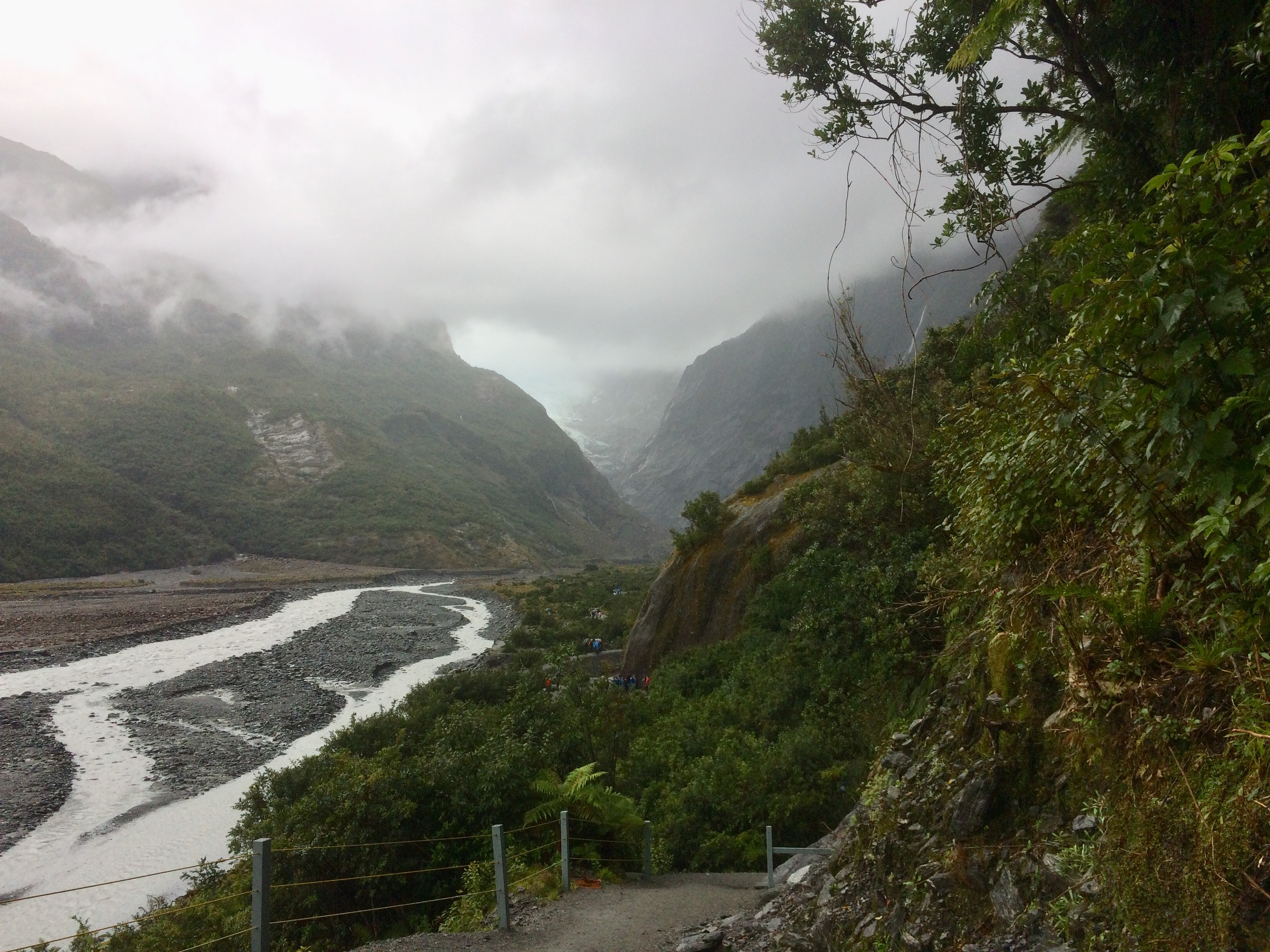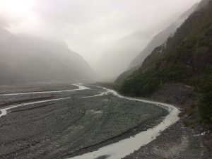 Man kann Franz Josef doch nicht den Rücken kehren, ohne den Glacier gesehen zu haben, denken wir. Also wieder ein paar Kilometer zurück und rein in den vor Nässe dampfenden Busch. Die schmale Glacierstraße windet sich durch‘s Tal und endet an einem Endpunkt mit Wendemöglichkeit und Damen-/Herren-/Behinderten-Toilettenhäuschen. Aus dem Geniesel ist ein kleiner Landregen geworden. Anoraks und Schirme sind hilfreich für einen Gang zum Glacier, der vom Department of Conservation, künftig nur noch DOC genannt, mit Rückweg auf 1,5 Stunden angesetzt wird. Das Hinweisschild muß, wie wir dann selbst erfahren, mindestens 9 Jahre alt sein, denn Franz Josef hat sich mittlerweile erheblich weiter in die Berge zurück gezogen. Unsere Wanderung ist inzwischen eine richtig nasse Angelegenheit. Nach jeder Wegbiegung türmt sich wieder ein Geröllwall auf, und die Wasserfälle sind beachtlich. Keine Chance, bis zum Fuß des Gletschers vorzudringen, ohne vollkommen aufzuweichen. Wir geben auf, auch den aufblitzenden Plan, für 99$/Person (Chinese New Year-Deal?) einen Heli-Flight zu nehmen. Für das Geld kaufen wir uns lieber mal ein ordentliches Lammsteak und ein, zwei Pint Beer. Ist wahrscheinlich sogar umweltfreundlicher. Weiter geht‘s an diesem Tag nach Greymouth. Hoffentlich sind morgen auch die Schuhe wieder trocken.