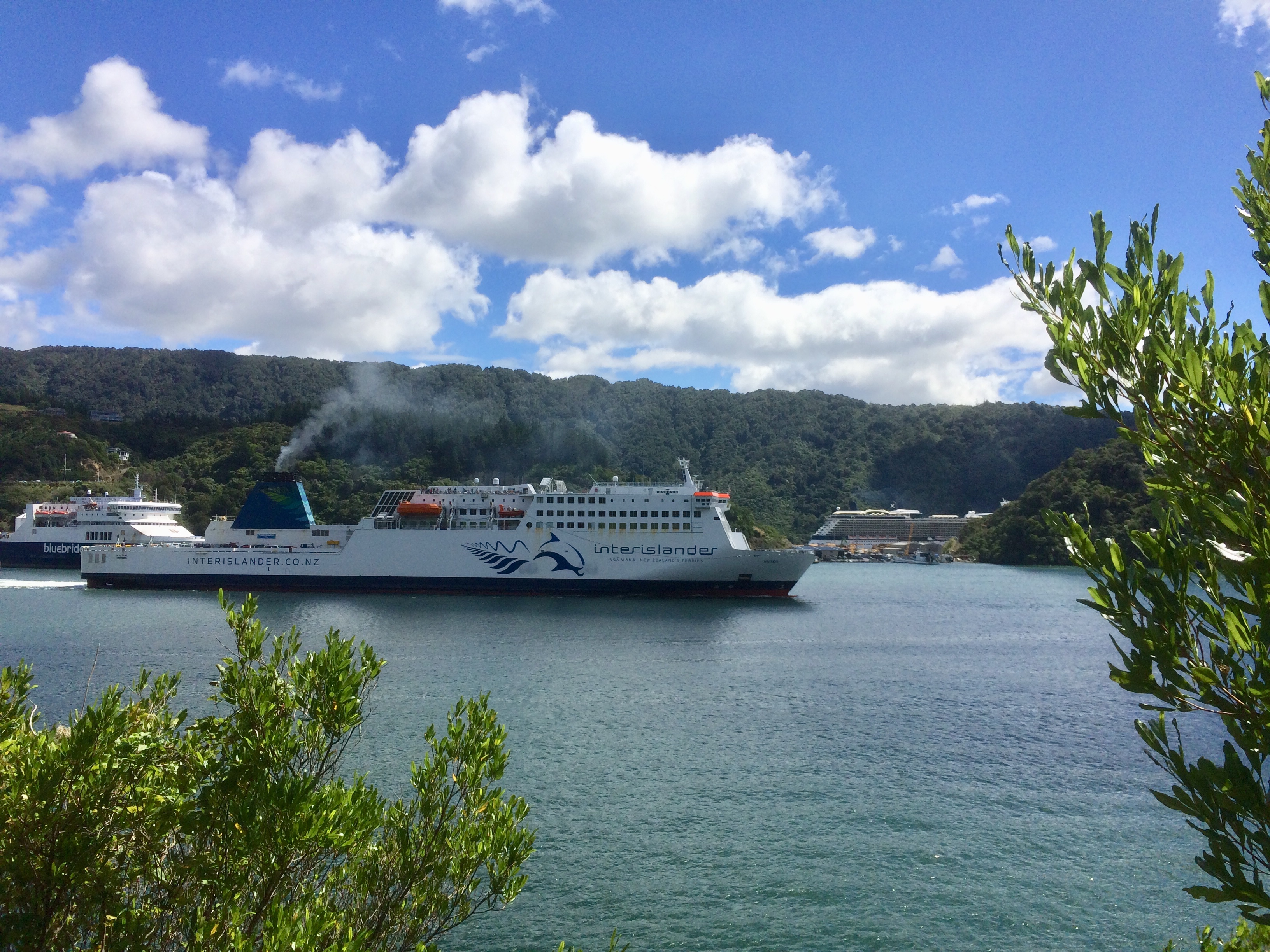 Im Vordergrund zwei Fährschiffe von Interislander und Bluebridge. In der Bucht dahinter gut versteckt liegt ein riesiges Kreuzfahrtschiff vor Anker.