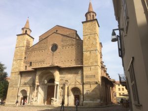 Wir haben diese zwei Wochen sehr genossen und uns vortrefflich erholt. Nun aber geht es auf reichlich holpriger Autobahn vorbei an Follonica und weiter Richtung Norden. In Fidenza wollen wir diesmal einen Halt einlegen, zumal Edeltraud bisher noch nie in Herrenbergs italienischer Partnerstadt war. Unser kleines Hotel liegt nicht nur sehr zentral in der Innenstadt, sondern hält auch einen bewachten Parkplatz bereit. Trotz der immer noch beträchtlichen Sommerhitze machen wir uns auf einen Stadtrundgang. Die Piazza Garibaldi ist wie ausgestorben. Auch auf den Straßen und Gässchen sind kaum Menschen zu sehen. Als wir vor der Cattedrale di San Donnino stehen öffnet gerade der Messner die Kirchentüren und wir haben Gelegenheit, den eindrucksvollen, und vor allem kühlen Innenraum zu besichtigen.