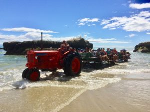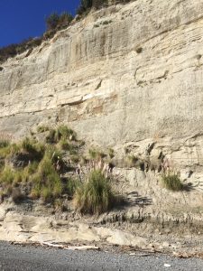 War ich 1998 noch zu Fuß die endlos lange Küste zum „Cape Kidnappers“ hinausgelaufen um die große Vogelkolonie der Gannets mit eigenen Augen zu sehen, so wählen wir diesmal den bequemeren, aber nichtsdestotrotz abenteuerlichen Weg mit Traktor und Anhänger bis zum Kap hinaus. Bei schönstem Sommerwetter geht unsere holpernde Fahrt an der Steilküste und Erdgeschichte vorbei. Man kann an den offenen Flanken lesen wie in einem Buch. Sediment- und Muschelablagerungen, Vulkanascheschichten und Kohleeinschlüsse, Millionen Jahre alte Baumstämme, die Vögeln heute als Nisthöhlen dienen, Kies- und Sandschichten, sind gut zu erkennen. Unser Guide und Traktorfahrer Ron macht immer wieder Pausen und erklärt die Besonderheiten.
