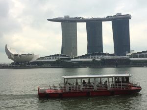 Das alles überragende „Marina Bay Sands“- Hotel vom „Merlion Park“ gegenüber aus gesehen.