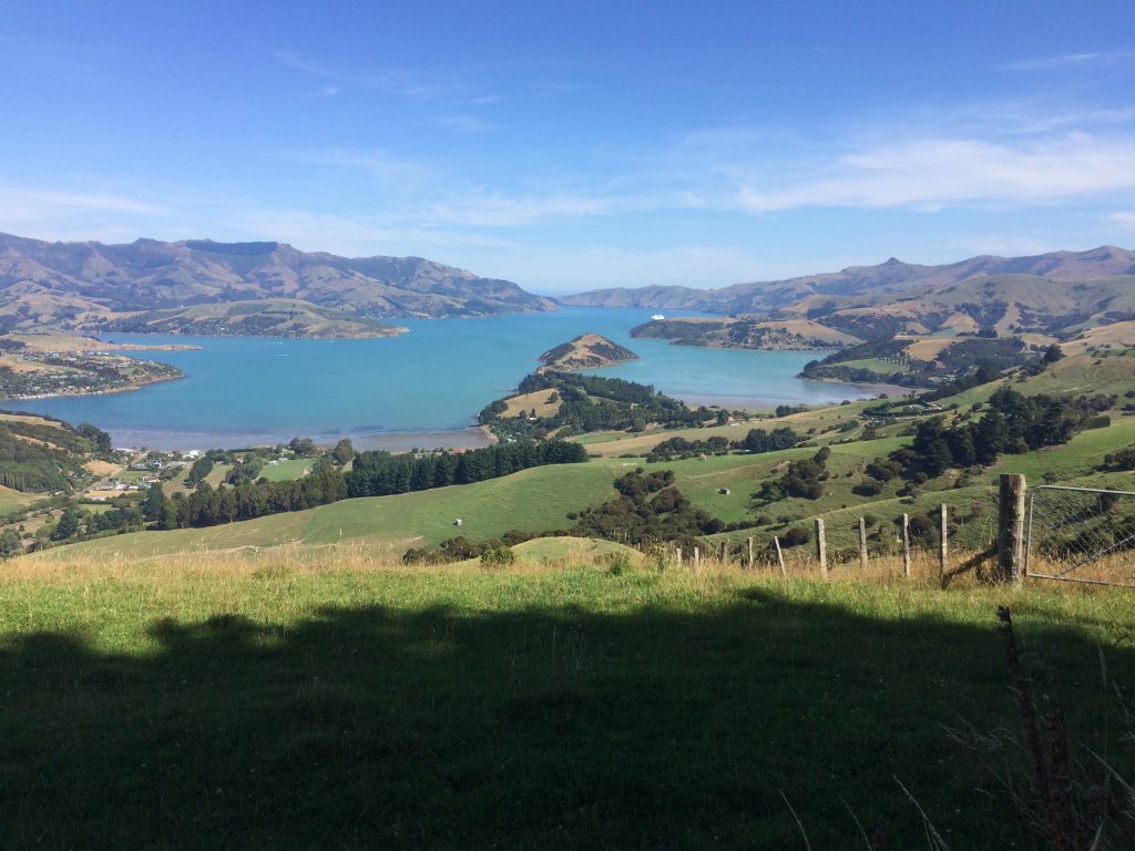 Heute heißt es: raus aus der Stadt und auf die Banks Peninsula (Maori: Te Pātaka o Rākaihautū). Auf der schmalen, kurvenreichen State Highway 75 erklimmen wir den Hilltop, den heute grünen Kraterrand dieses einstigen Vulkans. Von dort breitet sich in einem atemberaubenden Panorama die tiefe Bucht von Akaroa Harbour aus. Ein beständiger Wind zieht viele Segler an. Seit der Hafen von Lyttelton aufgrund der zerstörerischen Erdbeben von 201o und 2011 für Kreuzfahrtschiffe nicht mehr angelaufen werden kann, legen die Riesenpötte in Akaroa Harbour an. Dann überschwemmen Gruppen von Kreuzfahrern für einige Stunden die Bucht. Wir lieben es daher eher beschaulich und genießen unser neues Quartier, das mit viel Liebe eingerichtete „Halfmoon Cottage“ der gebürtigen Holländer Cornelis und Margo. Der üppige Garten ist ein Paradies, nicht nur für Erholung suchende Reisende, und die Zimmer sind individuell und geschmackvoll eingerichtet.